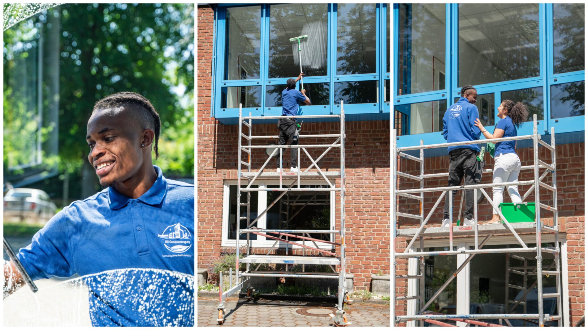Wir setzen bei der Glasreinigung ausschlieĂlich geschulte und professionelle GebĂ€udereiniger ein, die bei Bedarf auch Steiger und Teleskoparme nutzen.